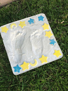 We also made a new stepping stone--we have one from Jackson's prints at four months old. I wanted to make one last year when Riley was the same age but I had one hand and two kids...didn't work out. So here's our second stone to a garden path (someday)...Jackson is 4 years, 4 months, and Riley is 16 months. They both enjoyed decorating the stone and Riley said, "star" for the first time.